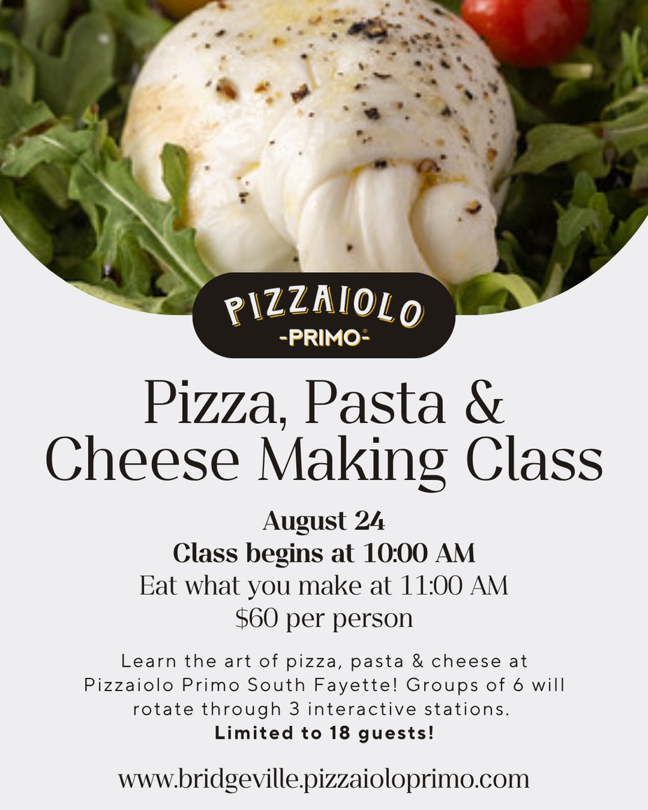 2026-02-22 10:00:002026-02-22 12:00:00America/New_YorkPizza, Pasta, and Cheese Making ClassExperience the art of Italian cooking during a hands-on Pizza, Pasta, and Cheese Making Class on Sunday, Feb. 22 at 10 AM. 🍕🍝Led by Pizzaiolo Primo Chefs Chandler and Tony, this interactive experience includes three stations, a complimentary drink, a meal, and a special take-home gift.Head to OpenTable and click on “Experiences,” or call 412-838-7572 to reserve your spot: pizzaioloprimo.com #GoodFoodPGHPizzaiolo Primo South FayettePizzaiolo Primo South Fayettesouthfayette@pizzaioloprimo.com